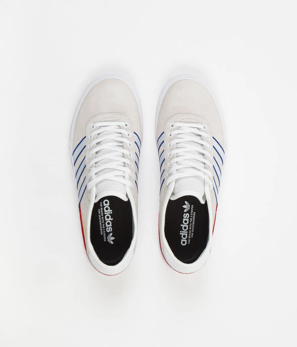 Inspired by classic court-side silhouettes from the archives, these crystal white and royal blue Delpala Shoes from adidas are designed to provide exemplary skate specific comfort backed by the brand’s ode to authentic styling. Boasting a minimalistic and streamlined appeal, these low profile skate shoes are styled with brushed suede and durable leather uppers, whilst the performance-orientated OrthoLite sockliner, vulcanised all white rubber outsole and the over spilt wrap around foxing ensures impact resiliency to suit any active skate style. Reinforced ‘t-toe’ rubber overlays complement the toe bumper for added protection against unexpected scuffs and scrapes, whilst the grippy gum rubber underfoot is designed to make light work of any desired terrain. Adidas’ iconic triple stripe sidewall detailings are creatively swapped for white and blue ribboned trims, whilst royal blue and regal red twin stacked fabric pipings can be seen wrapping around the heel as they stem from the reinforced midfoot. Gold foil ‘adidas’ trefoil branding accentuates the exterior facing, chevron stitched midfoot, while the practical 7-eyelet flat lacing system secures the flattened tongue across the natural arch of the foot to provide a heightened sense of on-the-go security to suit the wearer’s exact needs. Signed off with a classic, crisp white cut through collar across the fabric seamed ankle, these heritage rich Delpala Shoes pair past with present to create a sneaker suited to all purposes.