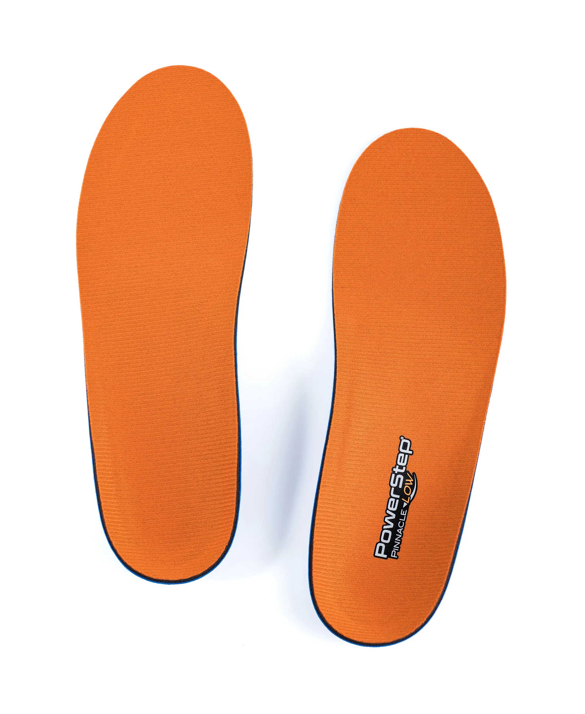 The PowerStep Pinnacle Low full length insoles with built-in low arch support and two layers of plush cushioning are the perfect balance of comfort and support. The Pinnacle Low insoles feature the signature PowerStep arch shape. The Pinnacle Low insoles cradle the arch and heel, adding stability and motion control to limit excess stress on feet, ankles, joints, and tendons.