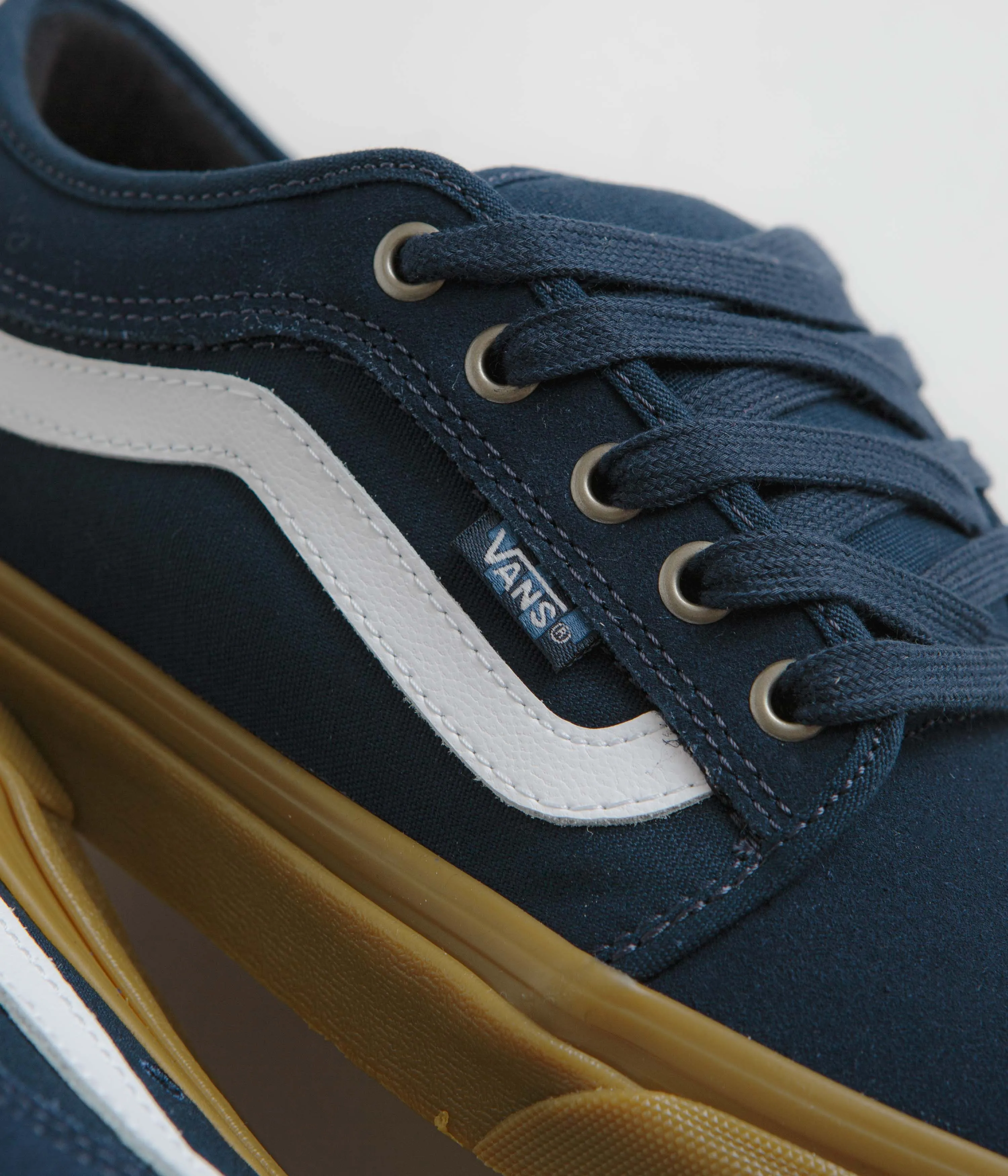 Vans Skate Chukka Low Sidestripe Shoes in Navy and Gum. Heritage inspired and influenced by the likes of the Chukka Boot and Authentic, this Vans Skate Chukka Low Sidestripe is styled with mixed suede and canvas uppers. Featuring a Pro Vulc Lite construction, POPCUSH™ cushioning and a gum rubber Waffle outsole, this navy Vans Skate Chukka Low Sidestripe is finished with leather sidestripes, metal lace eyelets, Van Doren™ compound and with Off The Wall Skateboarding heel plates.