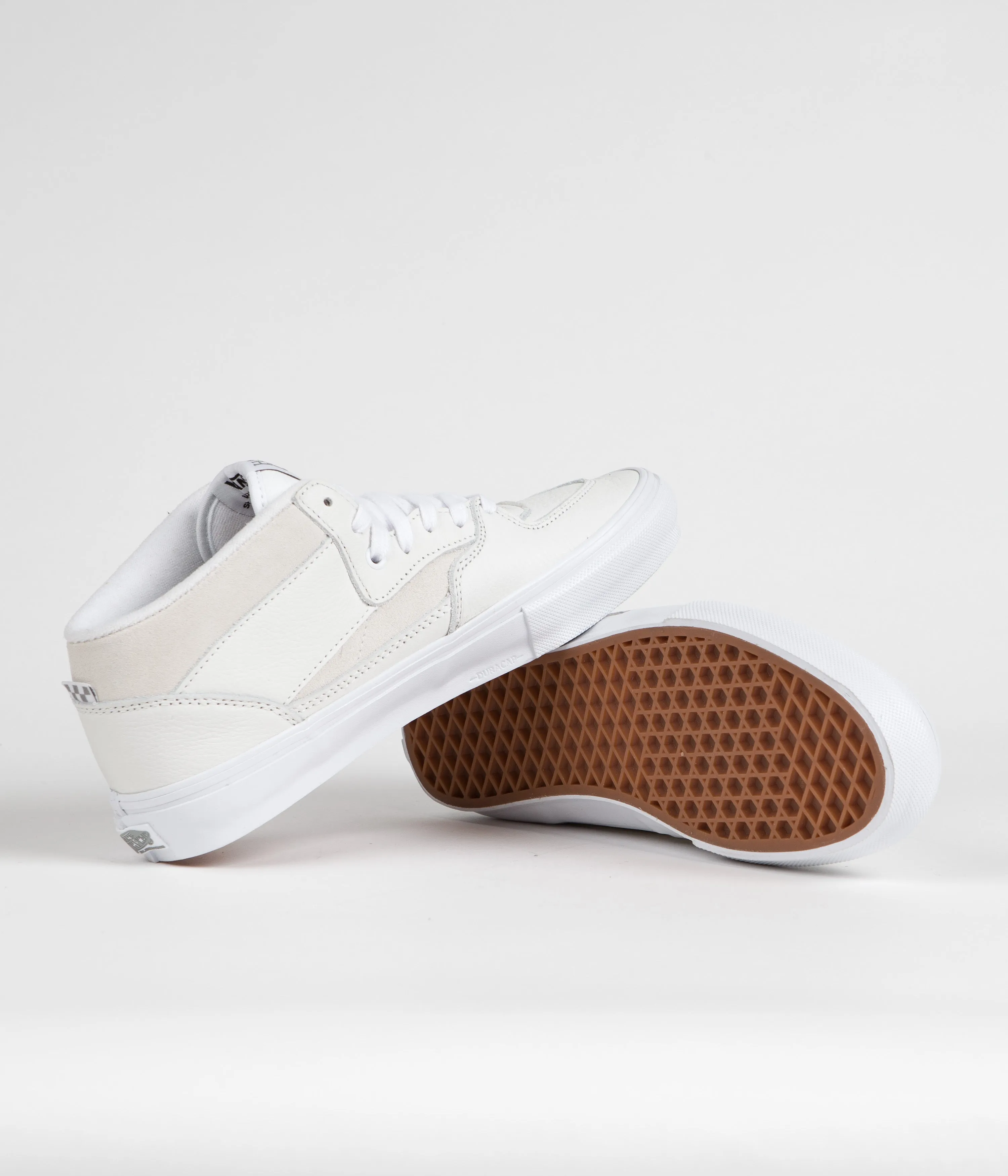 Vans Skate Half Cab Shoes in Daz White and White. Styled in a traditional colourway with white suede and leather uppers, this Vans Skate Half Cab arrives as part of the brand’s ever evolving Skate Classics collection. Updating Steve Caballero's signature to feature a moulded heel counter, a deeper toe knurl and higher side wall foxings, this white Vans skate shoe also features reinforced DURACAP underlays, PopCush insoles and SickStick gum rubber compounding. The gum rubber Waffle outsole is designed to deliver maximised grip, whilst the interchangeable laces secure the padded tongue in place and the internal tongue straps provide a locked-in fit. Finished with traditional Half Cab flag labels, with an all-new Skate Classics checkered label and rubber ‘Off The Wall Skateboarding’ heel scabs.