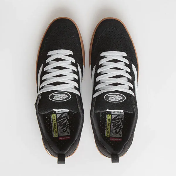 Introducing the latest vans shoes to propaganda streetwear & skate Vans Zahba Shoes in Black and Gum—a fusion of style and sustainability. Crafted with a recycled foam sockliner, a recycled inner heel counter, and a Biobased VR3Cush™ midsole, these shoes blend eco-conscious design with classic monochrome aesthetics. With a gum rubber ImpactWaffle™ outsole, SICKSTICK™ rubber cup, and reinforced DURACAP™ underlays, the black Vans Zahba delivers durability and grip. Contrast is key, highlighted by white leather side stripes, checkerboard flag labels, woven heel pulls, and printed insoles.